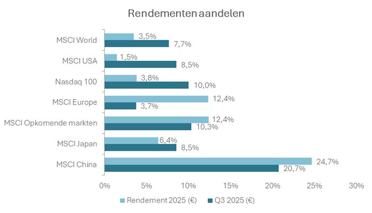 Met name aandelen van technologiebedrijven presteerden sterk in het derde kwartaal. In de VS zette de stijgende lijn door, maar in China ging het nog harder: de Chinese aandelenindex steeg met meer dan 20% in drie maanden, mede dankzij techbedrijven. De AI-hype leeft dus nog volop.