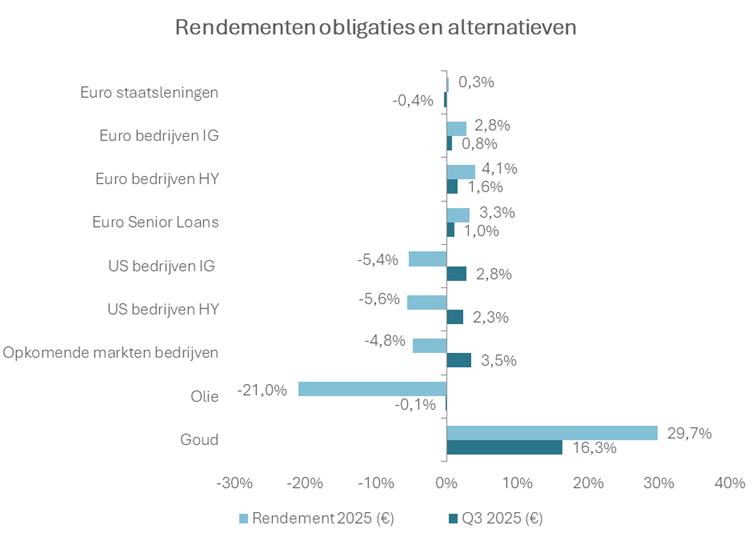 In onderstaande tabellen is een overzicht opgenomen van de gerealiseerde rendementen van diverse beleggingscategorieën (in euro). In donkerblauw zijn de rendementen over het derde kwartaal van 2025 weergegeven. In lichtblauw is het totaalrendement van de drie kwartalen in 2025 te zien.